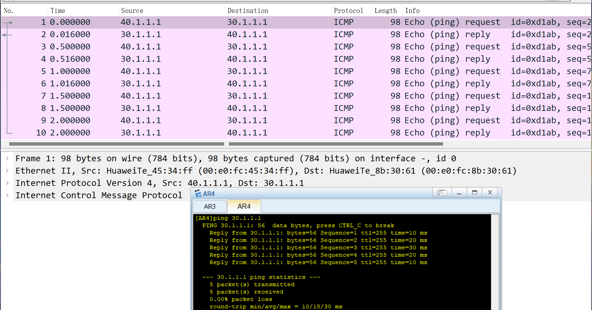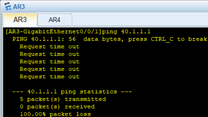 ・图示为AR3对AR4端口40.1.1.1使用Ping命令测试两台路由器的连通性。