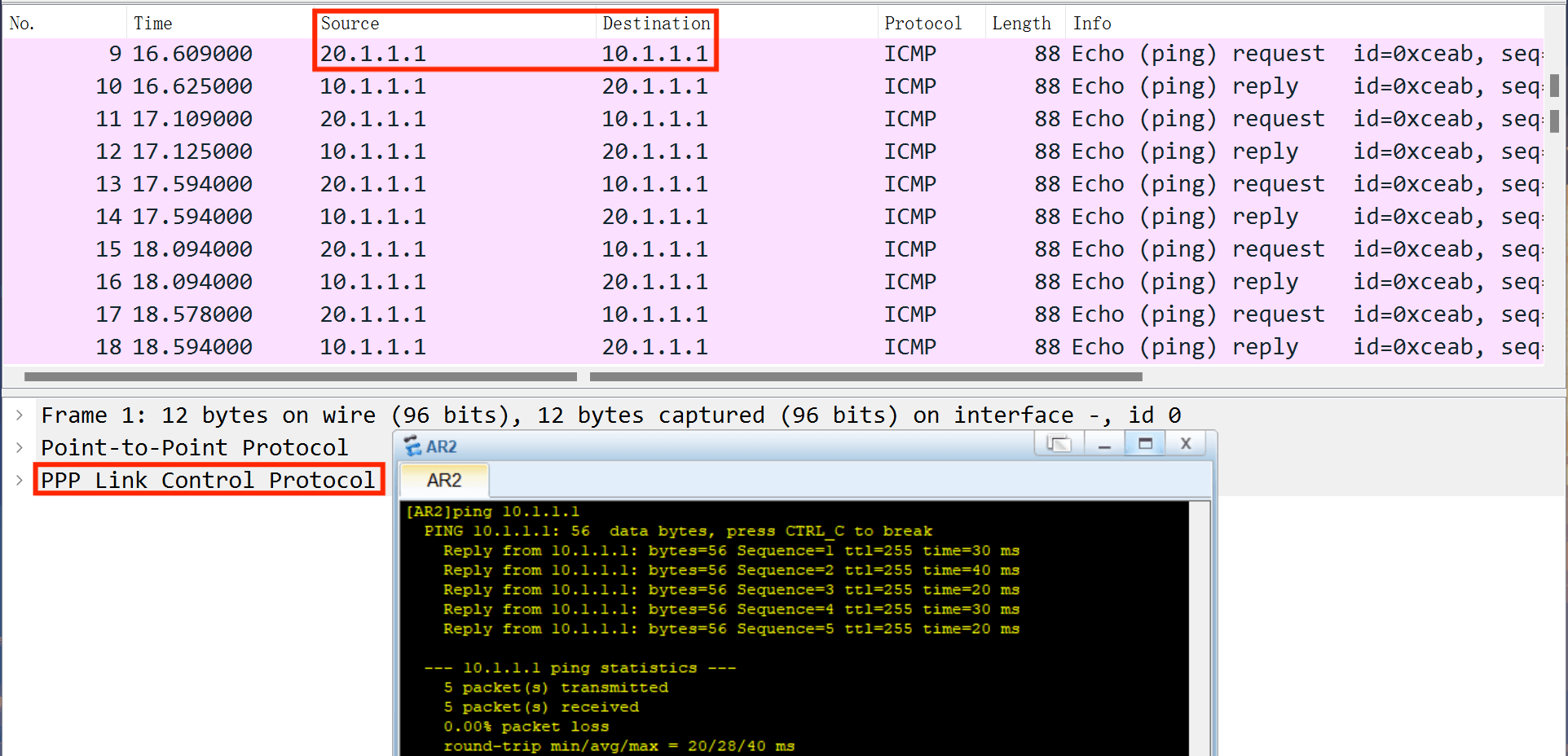 ・通过抓包可以看到,链路类型为PPP的时候,源目的地址(Source)和目的地址(Destination)不为同一网段也可以互通。