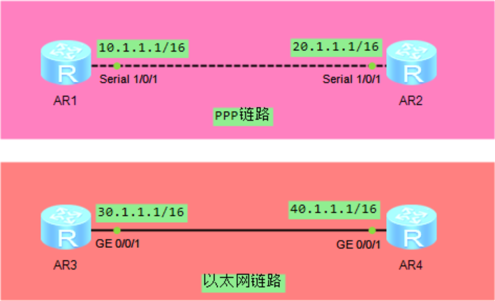・图结果证明AR3与AR4在以太网链路中,不同网段的IP地址在没有进行处理的情况下,链路是不能互通的。