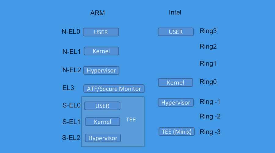 很多人看到上面这个图会心生疑问, Intel 对应TEE的技术不是SGX吗,怎么是跑在Ring -3【1】的Minix呢?事实上,SGX和ARM Trustzone有非常大的差别,如果非要映射,ARM在v9架构中提出的机密计算CCA和SGX进行类比更为恰当,两者都