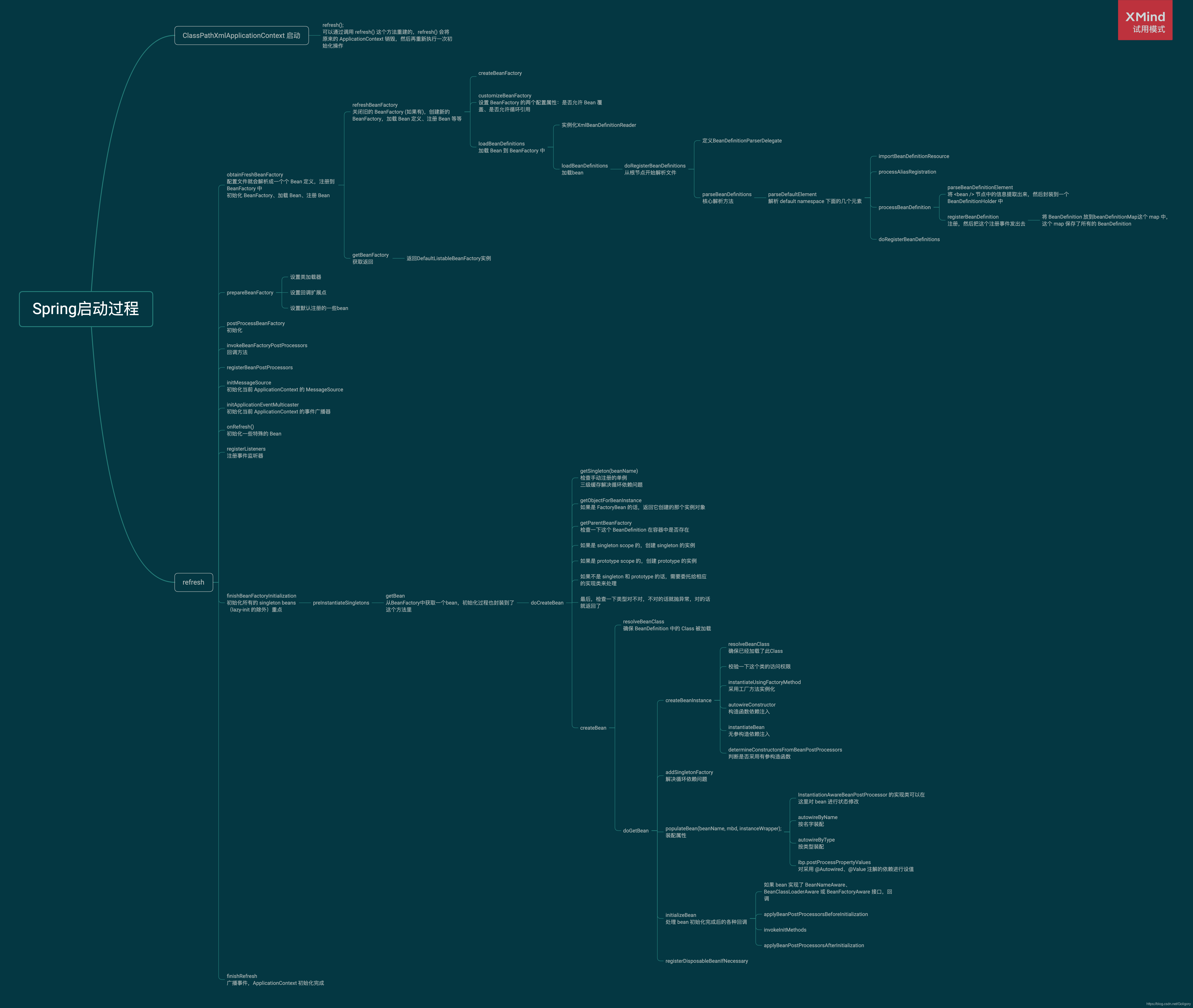 Spring启动过程,重要方法层级展开,做成个思维导图看着能够大概知道都做了什么,有利于大家理解Spring ,看不清就下载下来看,然后从源码寻找,下面的参考是源码解释,还不错,就是篇幅较长