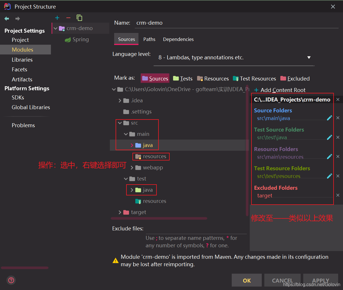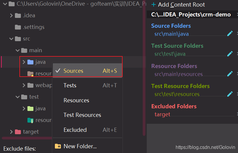 【步骤八】:设置Sources、Tests、Resources、Excluded的路径
