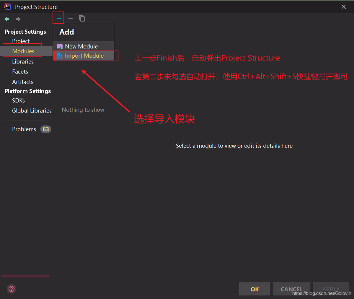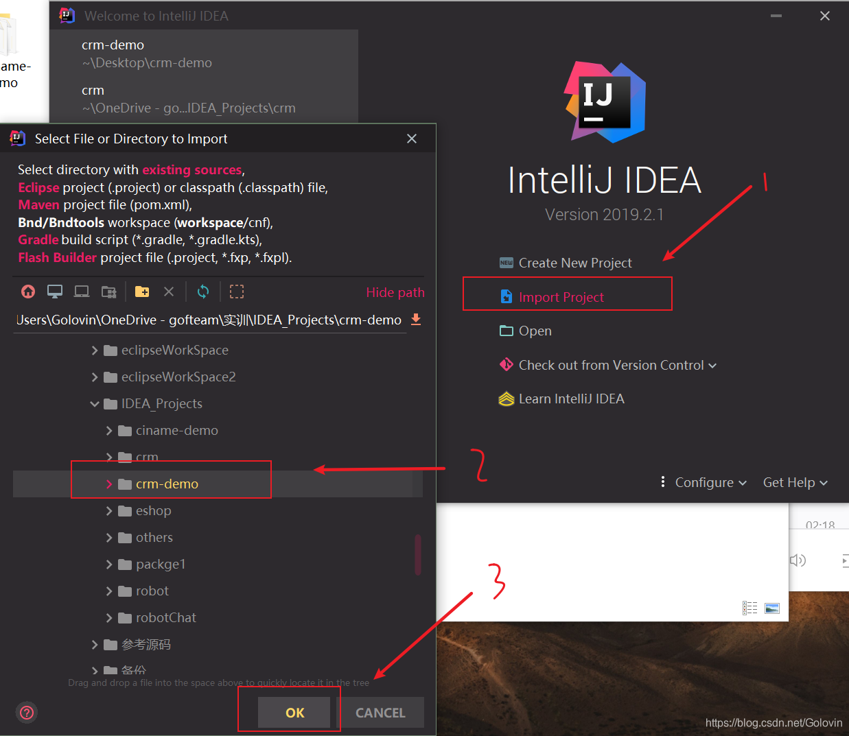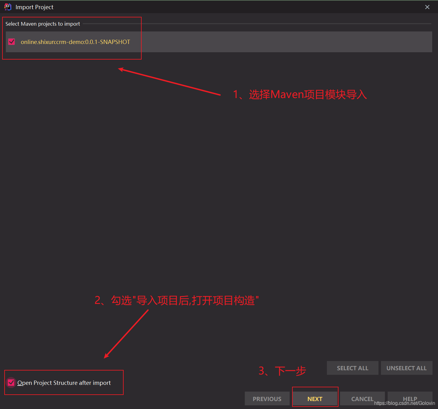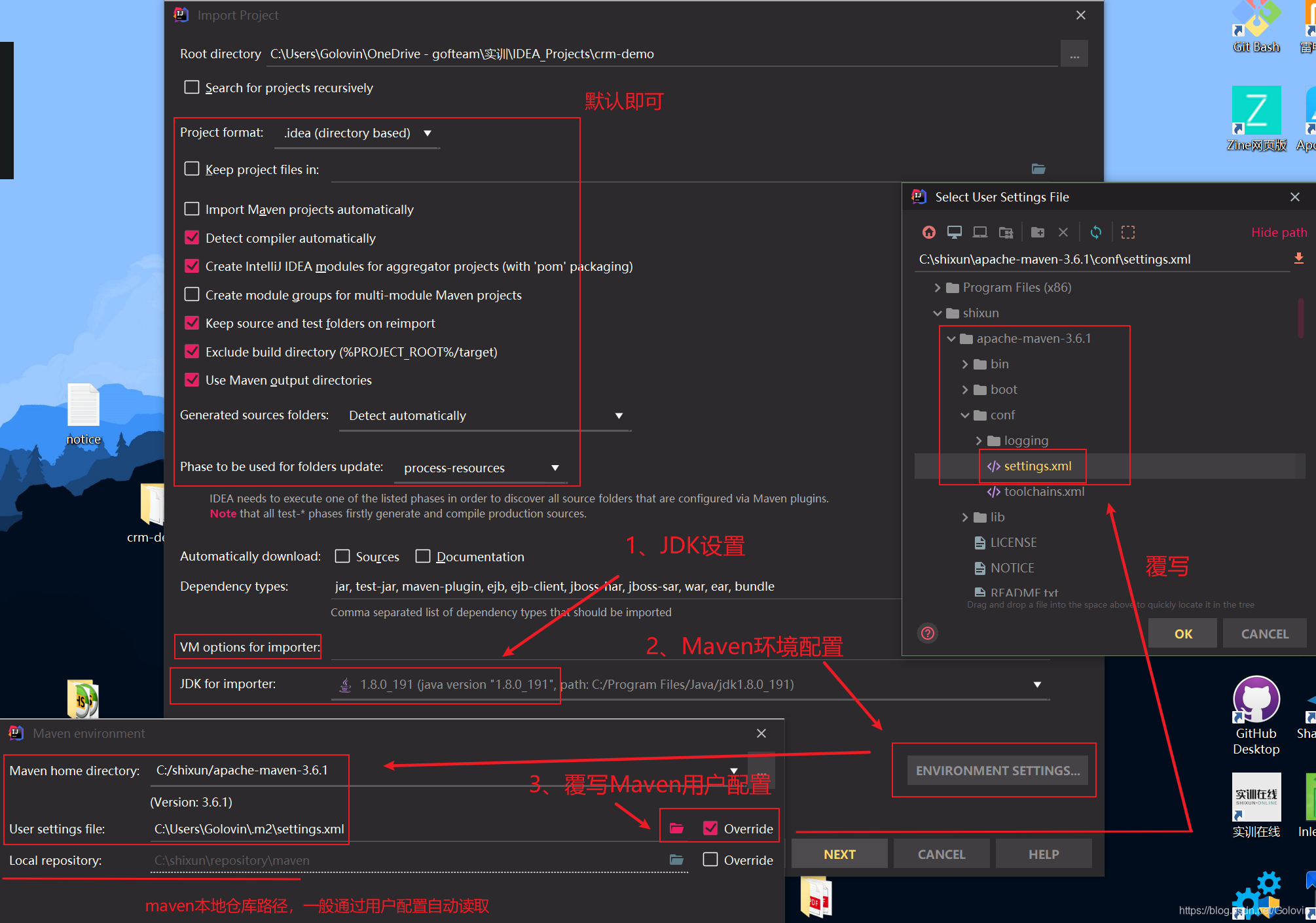 【步骤三】:导入项目以及配置(目录模块+JDK+Maven本地仓库)备注:若忘记了maven的本地仓库配置,idea会默认它自己的maven仓库的配置,在后面也可以通过【步骤十一】检查或再配置。