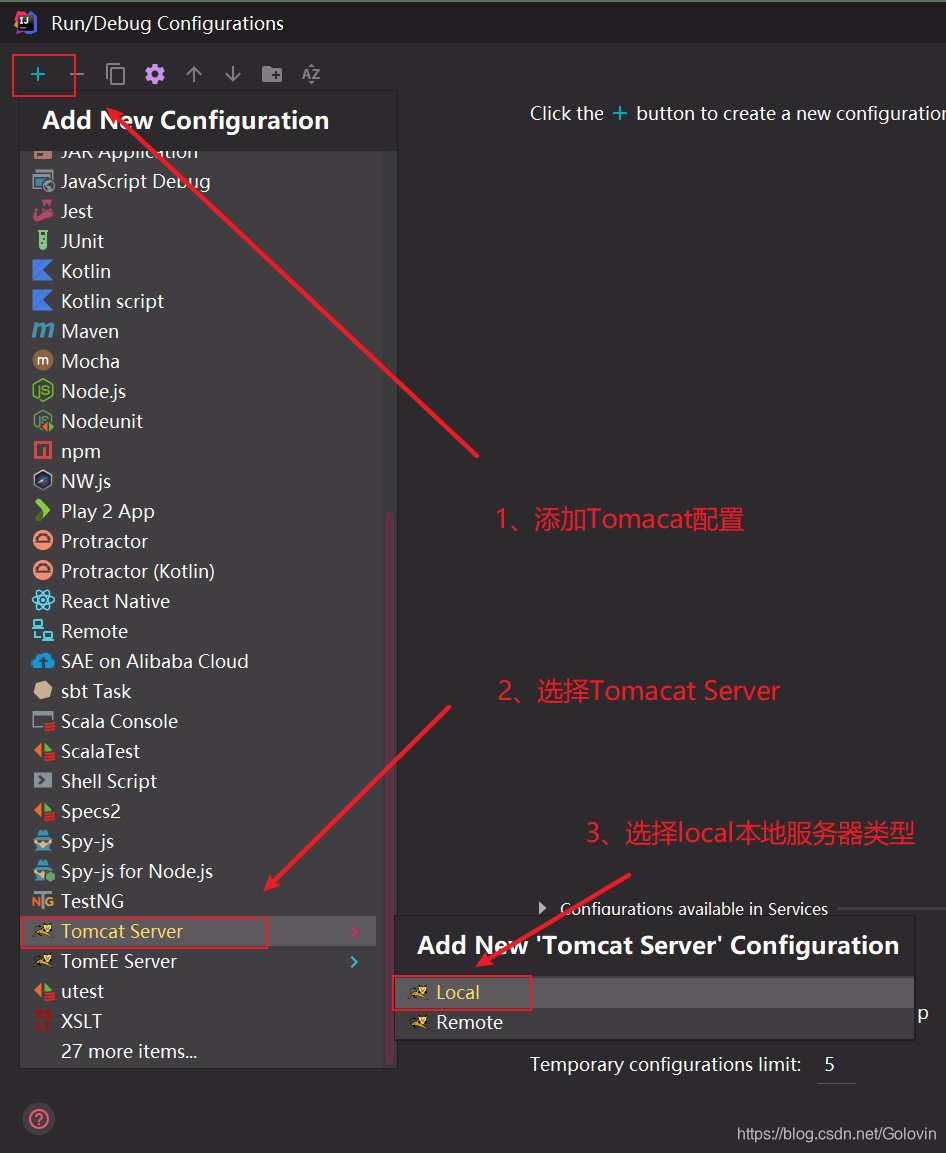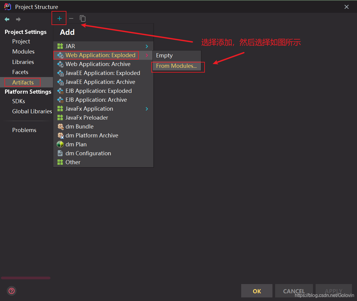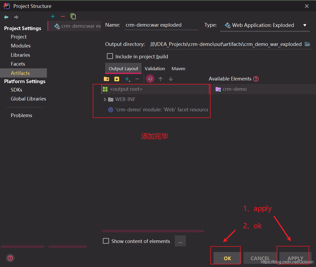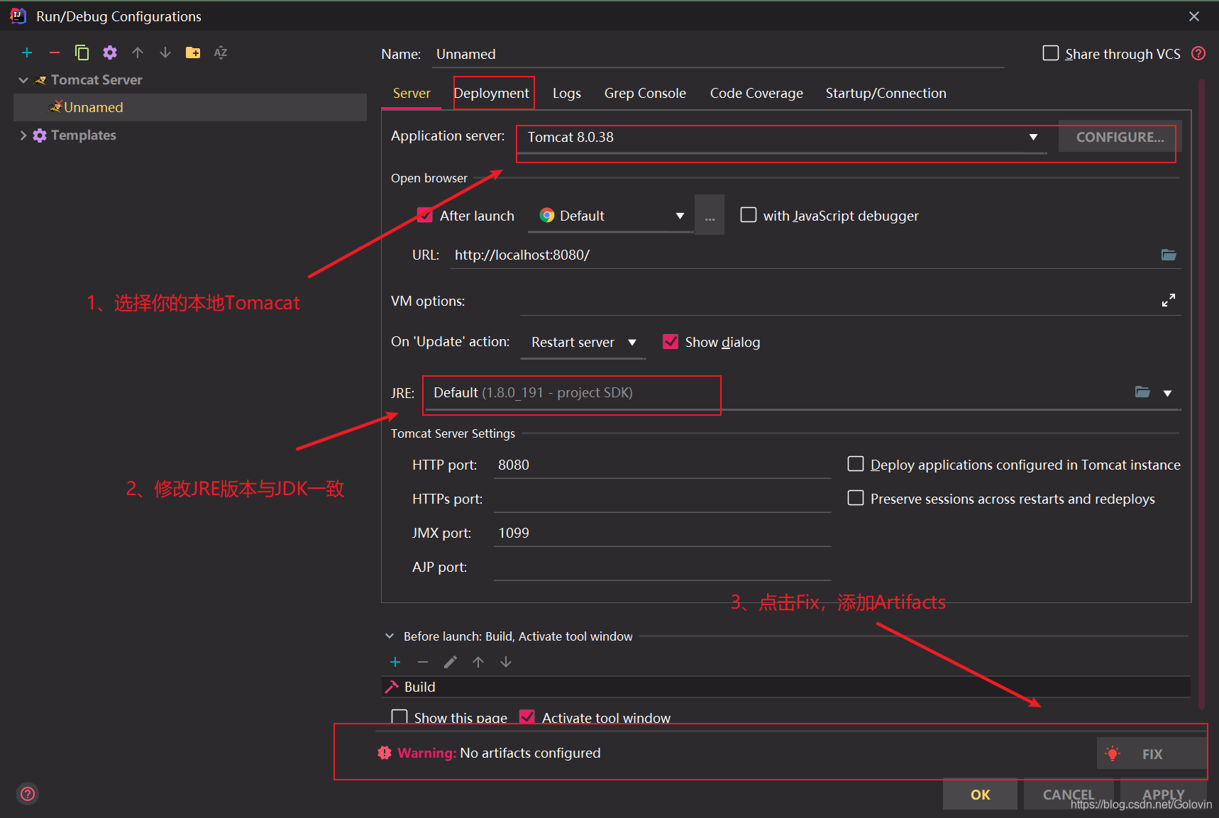 - 添加Artifacts到Tomacat的Deployment,以便启动服务器所需