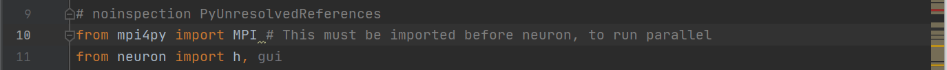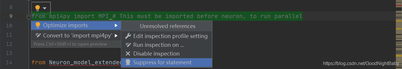 解决方法: 鼠标移动到这行代码,点击出现的黄色小灯泡,如下图所示,依次点击Optimize imports--Suppress for statement,结果会在该行代码前增加一行注释代码“ # noinspection PyUnresolvedReferences ”,且该行代码被点亮。