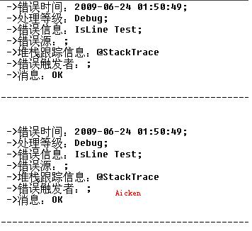 < IsLine.AppLog.Configuration > < YourName > < AppenderStyle > File </ AppenderStyle > < AppenderType > Text </ AppenderType > < AppenderInf > aaa / Log4Net1.txt </ AppenderInf > < AppenderContent >-> 错误时间:@eventDate; -> 处理等级:@level; -> 错误信息:@exception; -> 错误源:@source; -> 堆栈跟踪信息:@StackTrace -> 错误触发者:@trigger; -> 消息:@message </ AppenderContent > < LayoutInf ></ LayoutInf > < Level > Warn </ Level > </ YourName > </ IsLine.AppLog.Configuration >