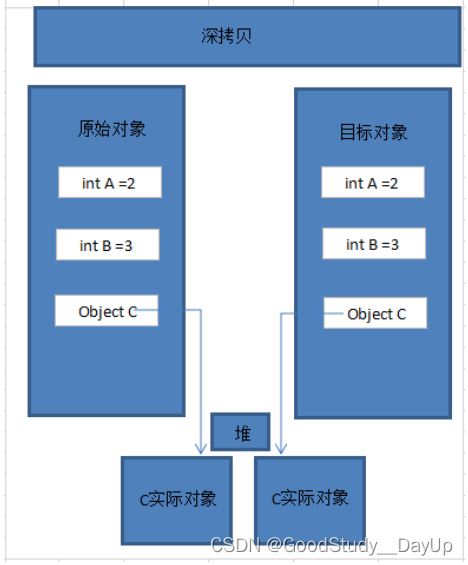 拷贝一个对象时,不仅仅把对象的引用进行复制,还把该对象引用的值也一起拷贝。这样进行深拷贝后的副本对象就和源对象互相独立。即深拷贝不仅复制所有的非静态值类型成员,而且也复制所有引用类型成员的实际对象。