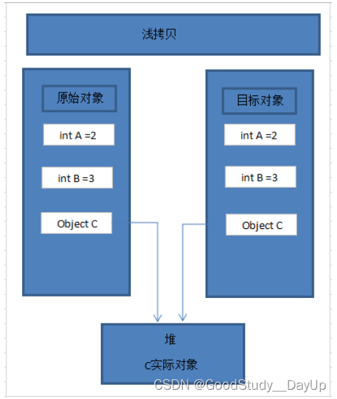 浅拷贝指拷贝一个对象时,仅仅拷贝对象的引用,但是拷贝对象和原对象还是引用同一份实体。此时,一个对象的改变都会影响到另一个对象。