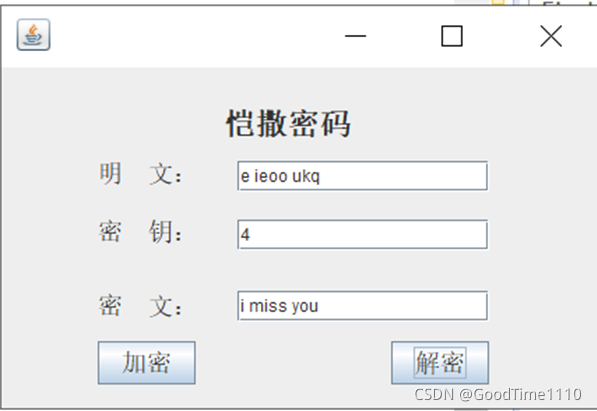 (2)对于恺撒加密实现图形界面,用户可以输入明文和密钥,在文本框中显示对应密文;
