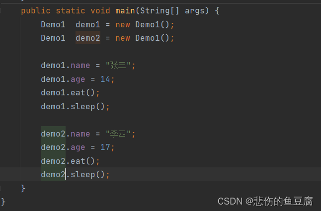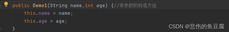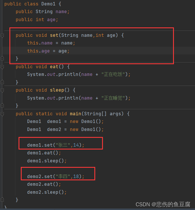 通过上述代码发现,每次想要给一个对象进行设置姓名和年龄的时候,总需要采用“对象名+·"去实现,在代码实现上有些繁琐,此时可以"将给姓名和年龄赋值"放在一个方法里面。