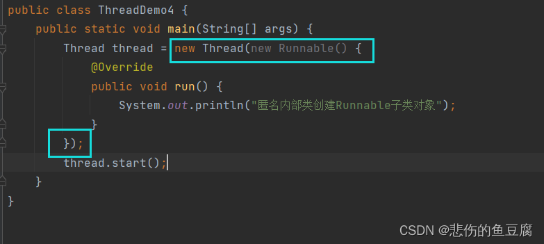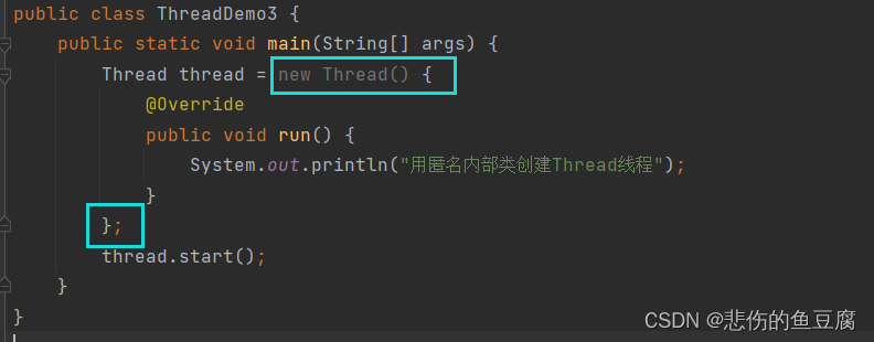 ③匿名内部类创建线程:大括号“{}”放到谁的后面就是针对哪个类创建的匿名内部类