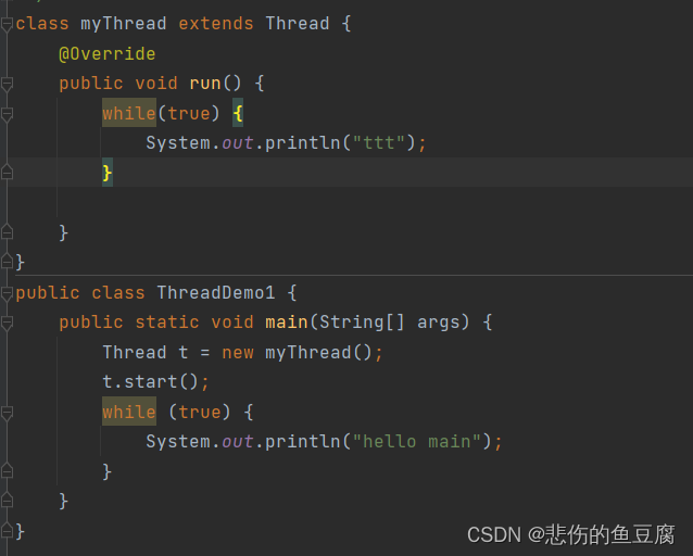 当在主线程中也写一个死循环打印的时候,查看结果是没有顺序的打印主线程和子线程