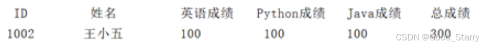 print(format_title.format('ID','姓名','英语成绩','Python成绩','Java成绩','总成绩'))