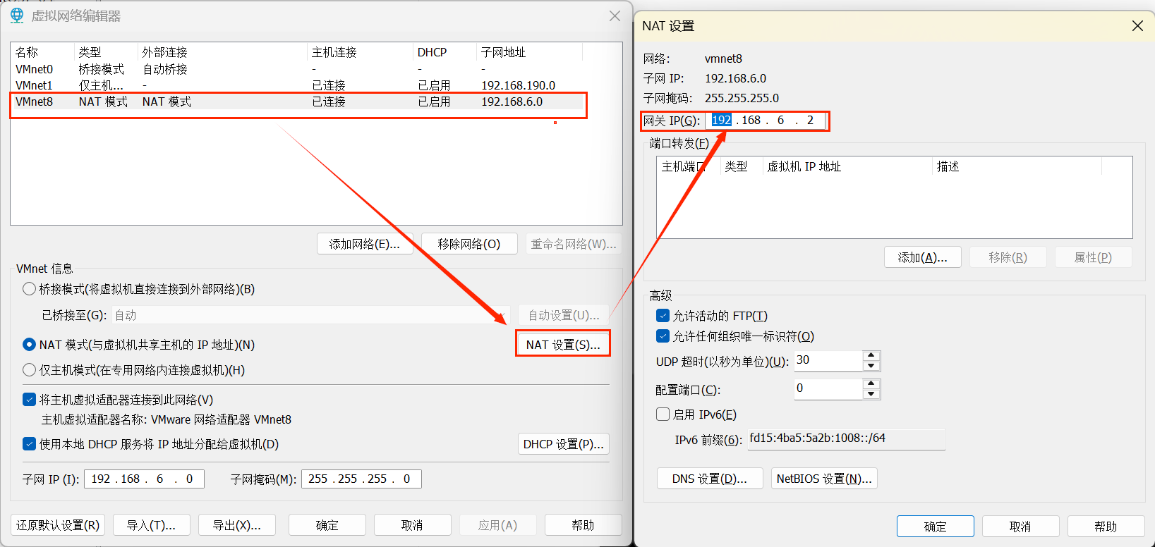根据上图的详细信息可知①IP地址为192.168.6.129②网关为192.168.6.2③DNS为192.168.6.2;