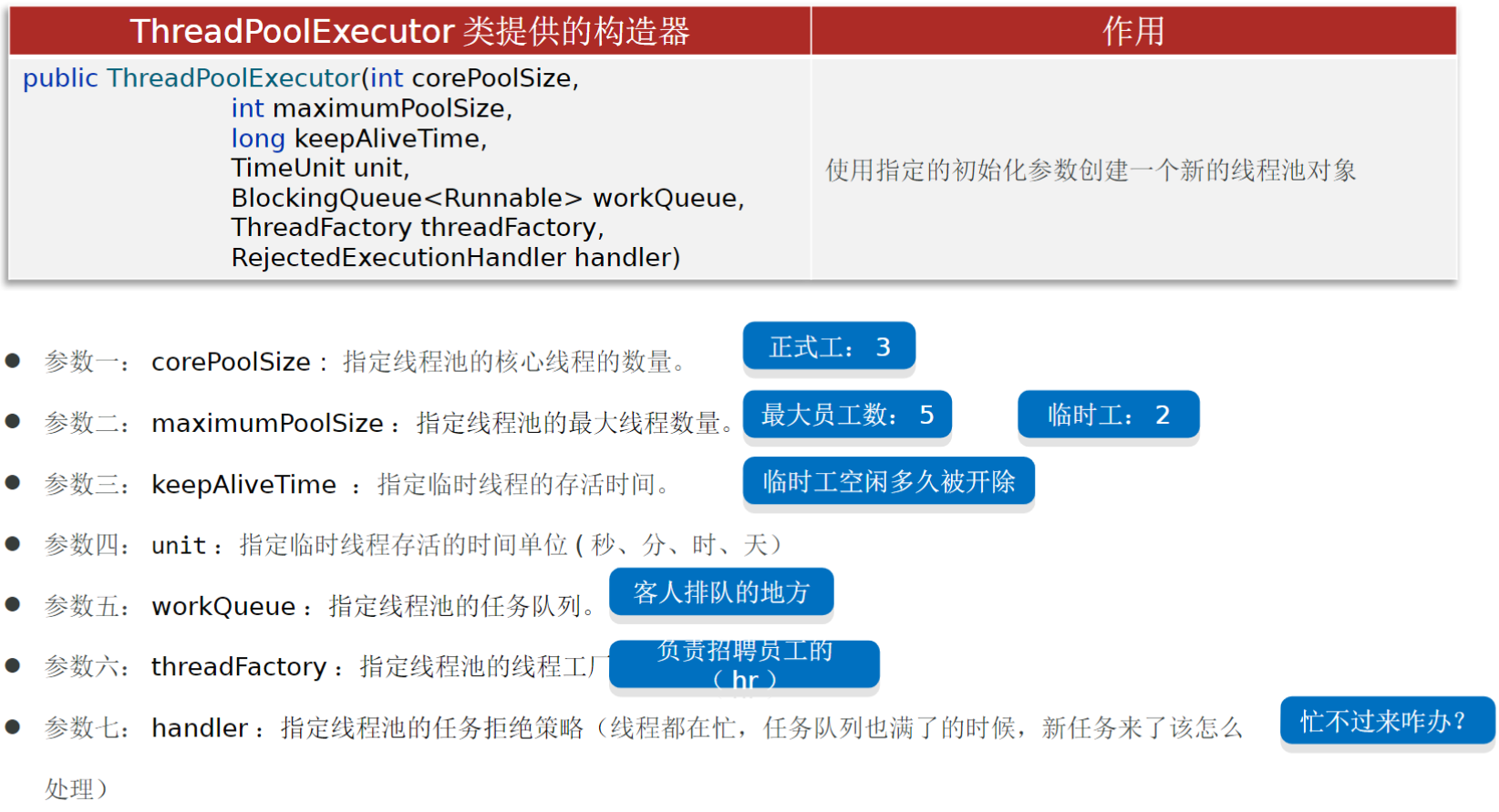 // 1、使用线程池的实现类ThreadPoolExecutor声明七个参数来创建线程池对象。