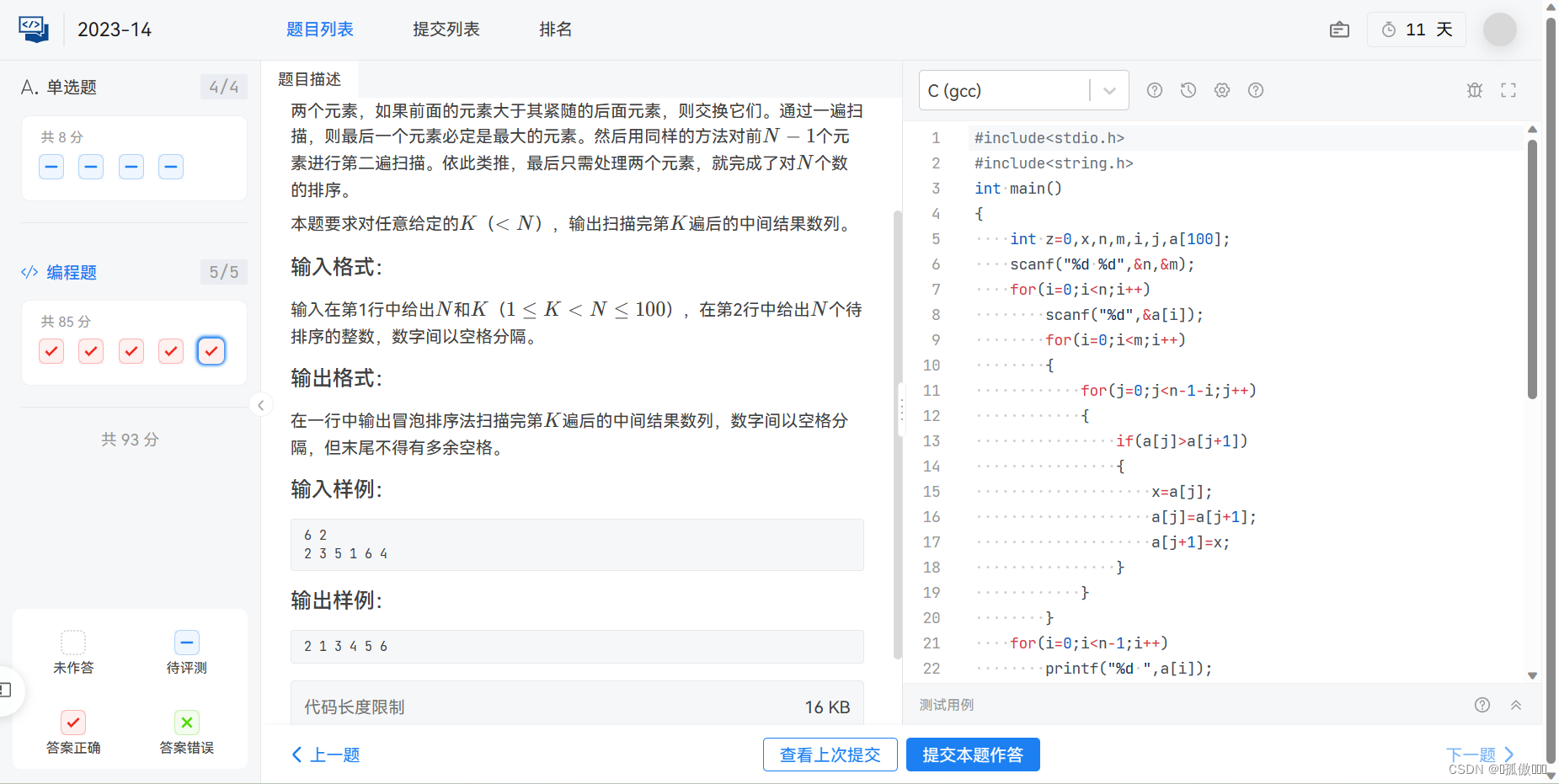 输入在第1行中给出N和K(1≤K<N≤100),在第2行中给出N个待排序的整数,数字间以空格分隔。