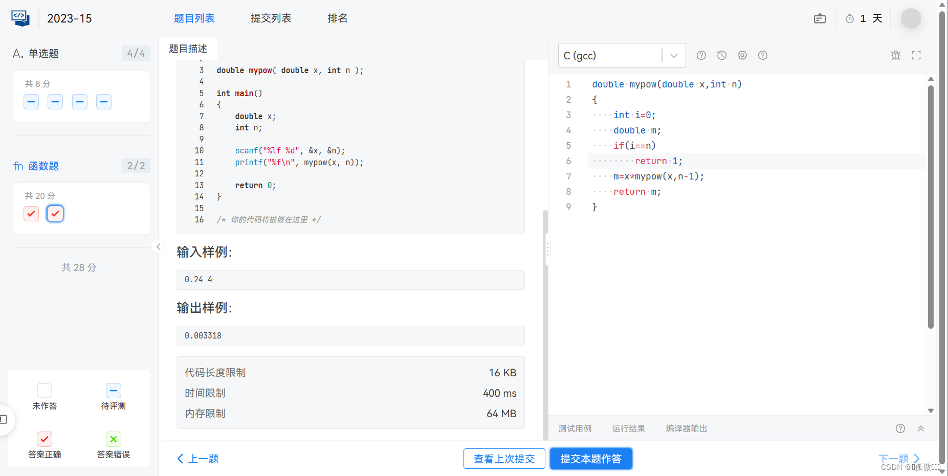 该文描述了一个名为mypow的函数,用于计算double类型变量x的n次幂。函数接受一个double型的基数x和一个整数指数n,返回x^n的结果。在给定的测试样例中,当x=0.244时,函数正确地计算出x的n次幂,输出结果为0.003318。