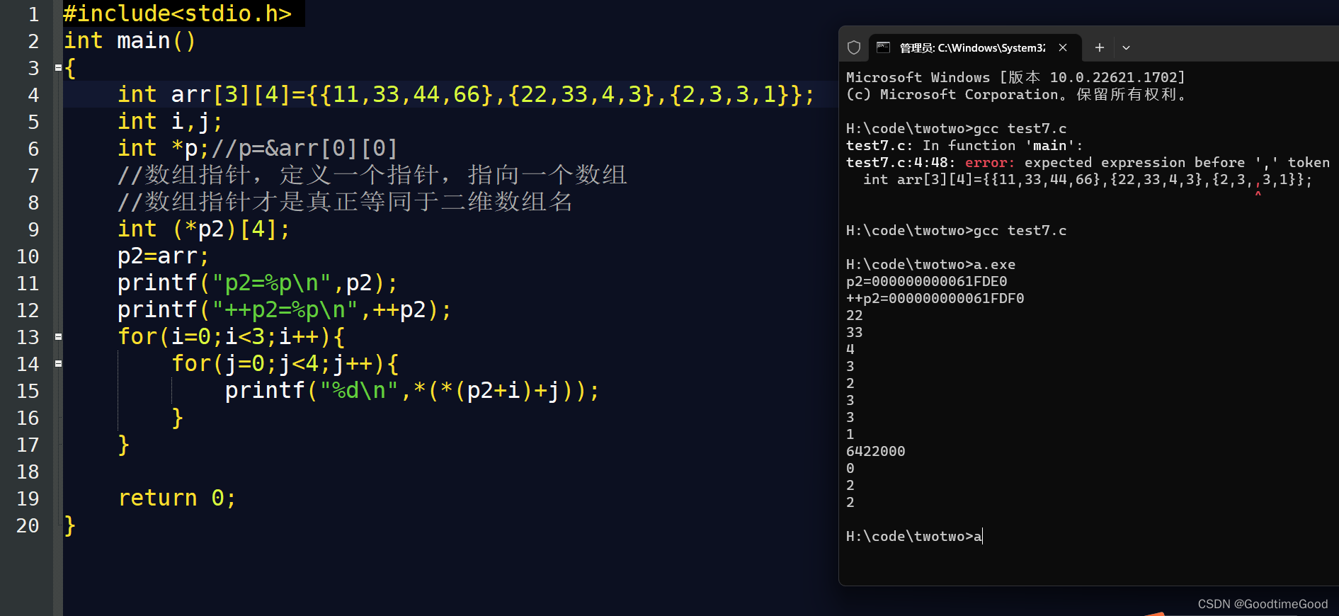 在数组指针中,数组指针的长度和数组的长度要保持一致。