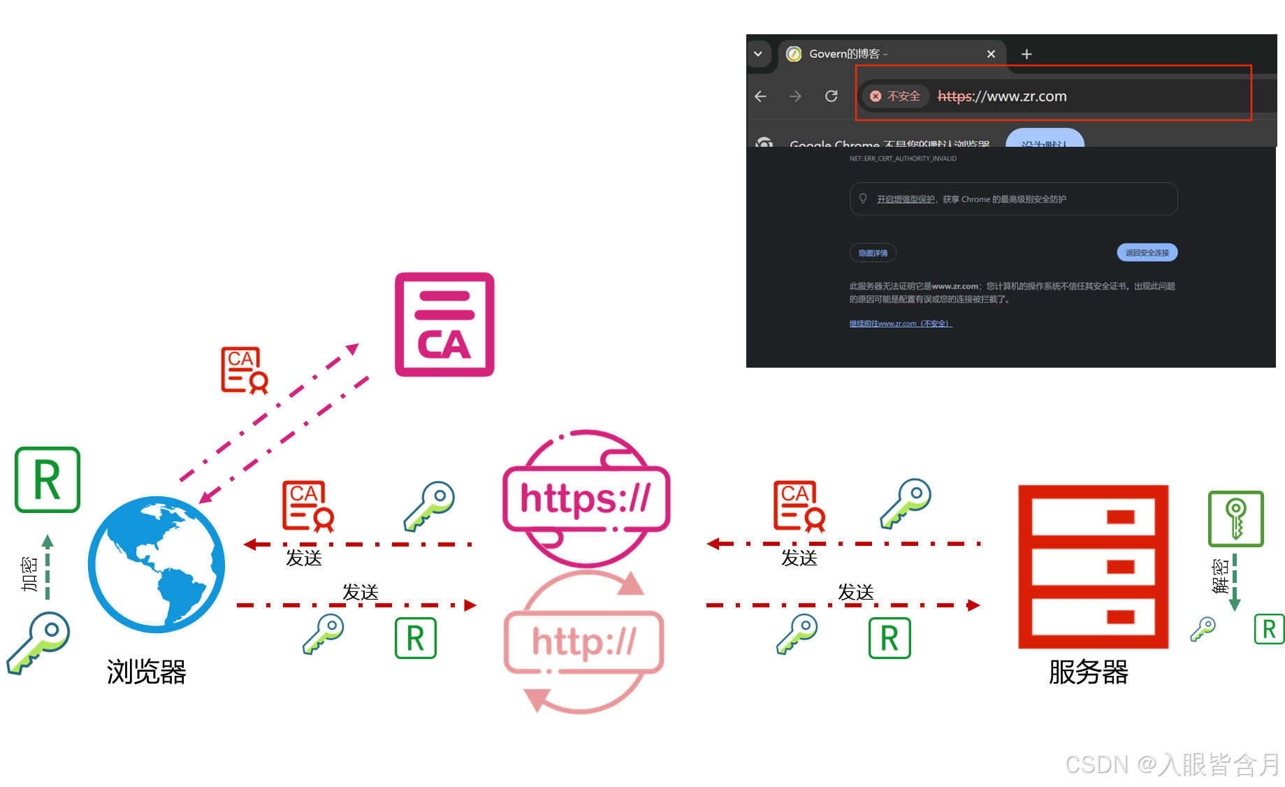 (3)客户端验证证书:客户端浏览器会去CA机构验证证书的合法性,如果不合法则会报出不安全提示;如果合法则会产生一个随机数R。