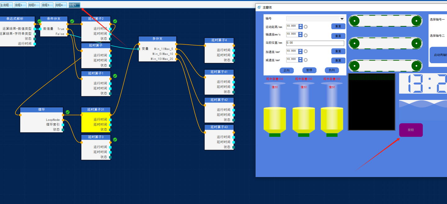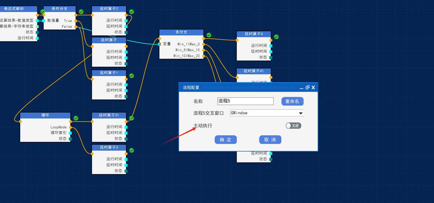 当单击此按钮时将触发对应流程5,触发流程前提条件必须保证流程 主动执行为关闭状态,才能触发。