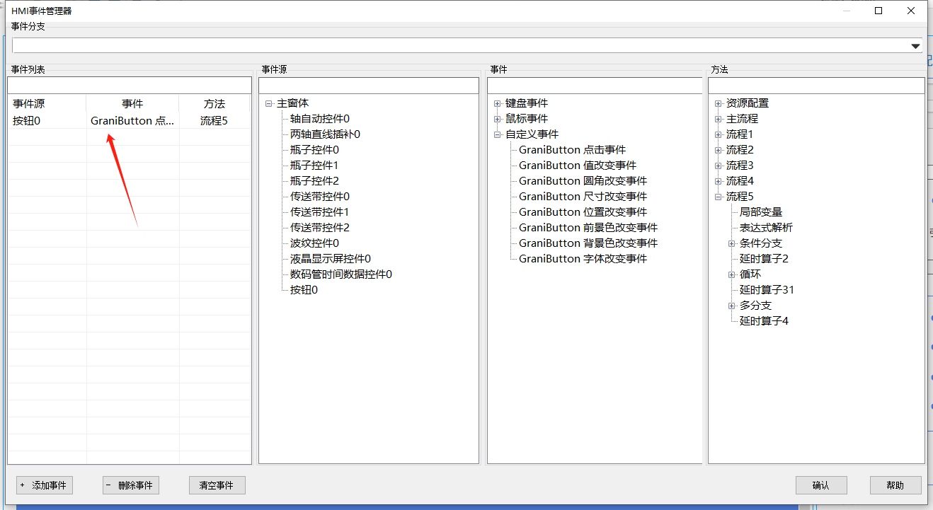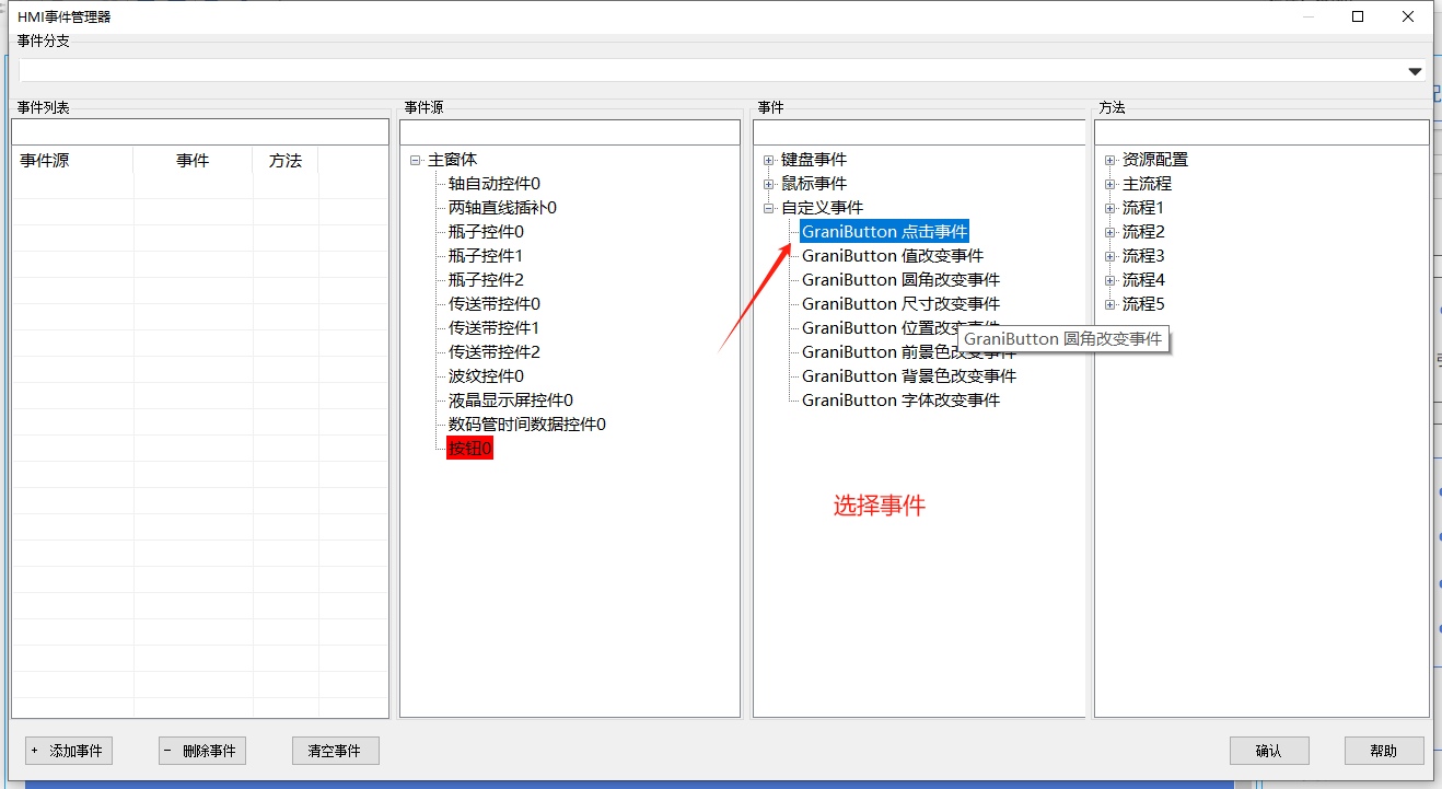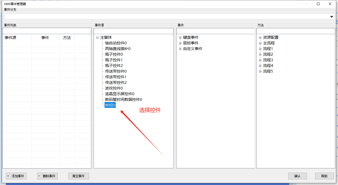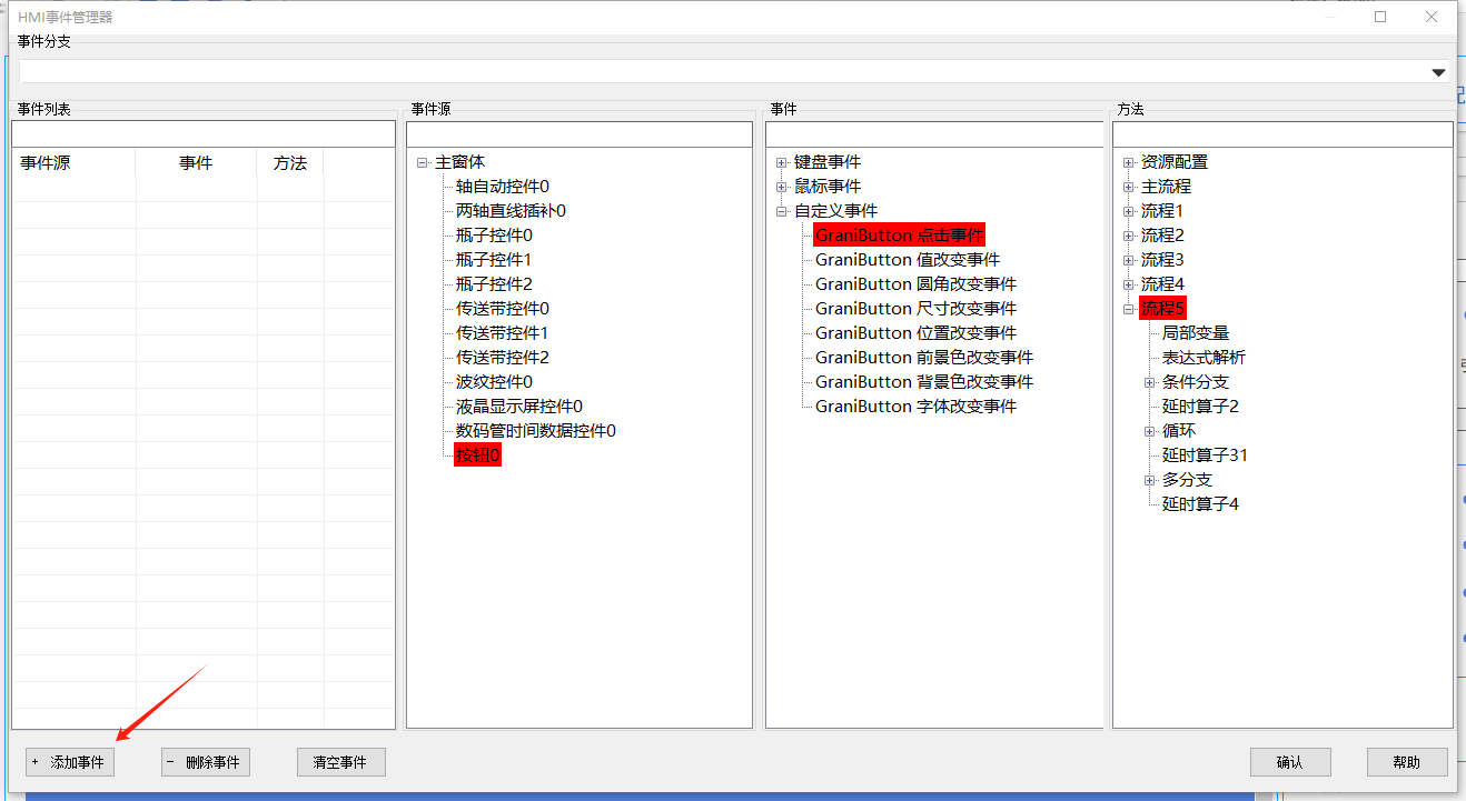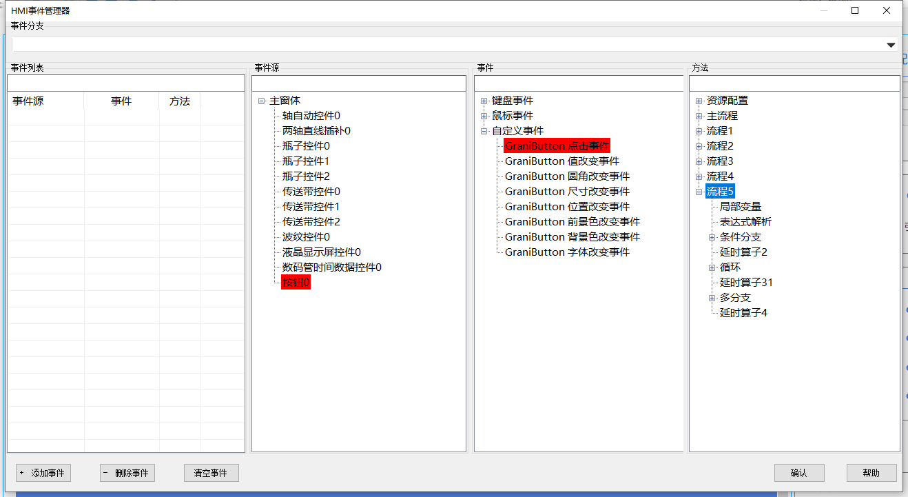 通过HMI设计器快捷菜单栏提供 事件管理器 按钮,点击此按钮将打开事件管理器设计器。事件管理器分为四部分组成,第一部分为事件列表,所显示当前添加的所有事件列表,第二部分为事件源展示当前HMI设计器窗体及控件,第三部分为事件,此列表根据选择不同控件而显示事件列表。第四部分为方法,所展示当前主任务设计器包括资源管理器所有算子列表。