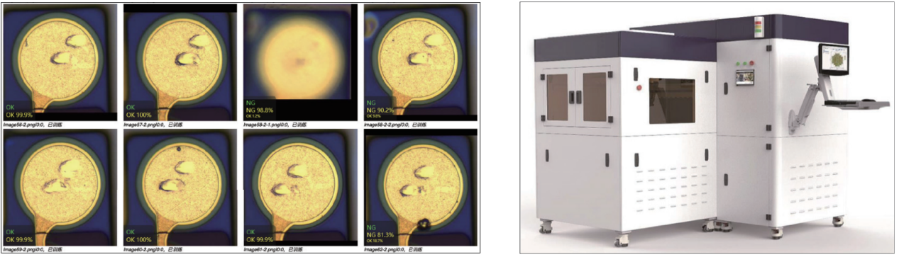 VCSEl芯片外观检查: 检测精度+/-0.27um, 检测准确率99.97%,检测速度80000pcs/h。项目采用GraniStudio视觉与 运控一体的图形化零代码开发软件,全过程零代码开发实现芯片的外观检测,实现MES交互,数据上传等。检查内容包括: 断晶、异色、残胶、多金、少金、露底、崩边等20多种缺陷。