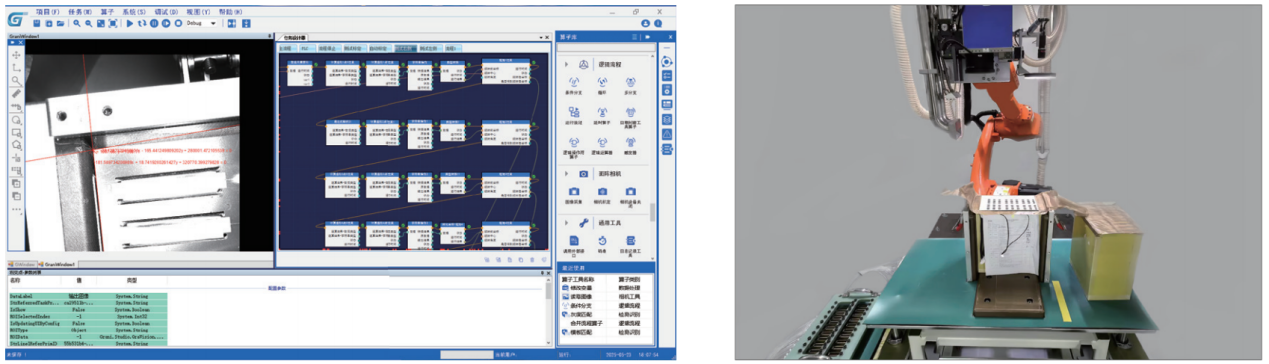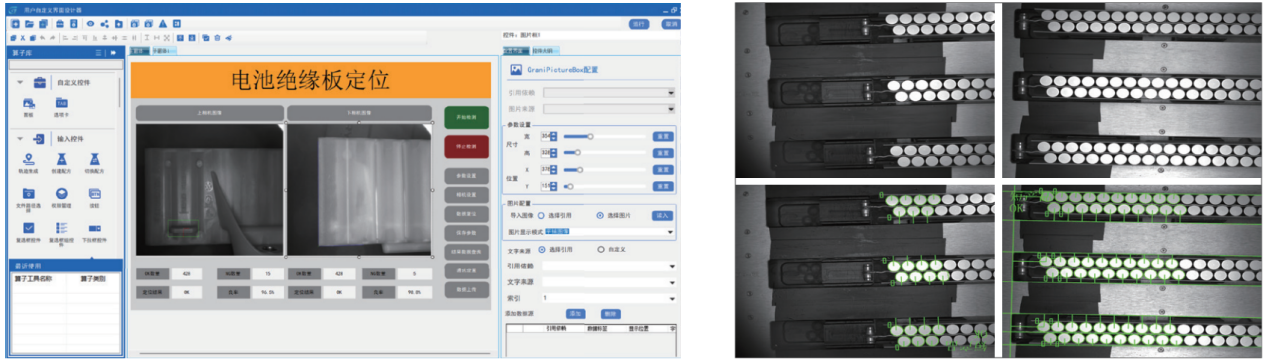 车载动力电池的组装关乎到电动汽车的安全使用,绝缘板是电池组之间一种重要的保证电池安全使用的组件,项目使 用GS软件高精度视觉定位以及检测算法,检测绝缘板安装方向以及正反,通过视觉定位引导机械手把绝缘板组装到位,排除绝缘板组装不到位以及方向不对的情况。