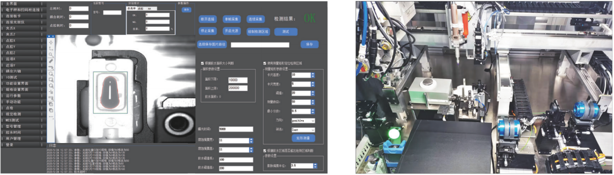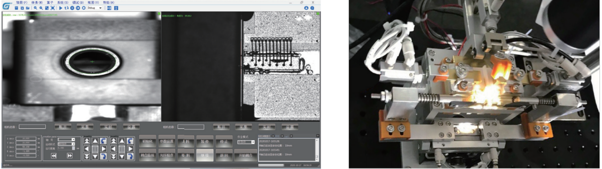 车载激光器是辅助车辆驾驶的核心器件,激光器的耦合是产品制造过程中最重要的工艺环节。设备通过六轴精密调节 平台控制并调整光纤位置及姿态,配合远近场光斑仪、上料机构、点胶机构、和视觉定位及检测机构,实现4通道激光器高精密耦合。设备控制程序由GS平台完全独立开发,软件包括视觉定位及检测、耦合功能、点胶功能、UV固化、MES交互等功能。