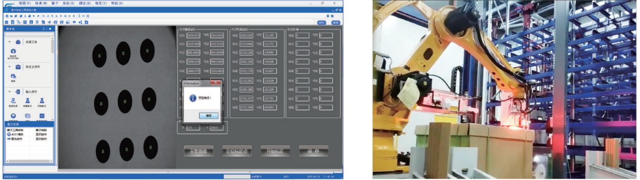 基于图像标定、目标检测、尺寸测量等算法技术,获取被测目标的形位信息,并将图像坐标转换为机器人坐标,引导机械 手精确获取目标位置和角度,进行定位和组装。实现机械手高精度定位包装盒上的喷码位置,引导机械手带喷墨阀进行喷码,并实现打包带精准打包。