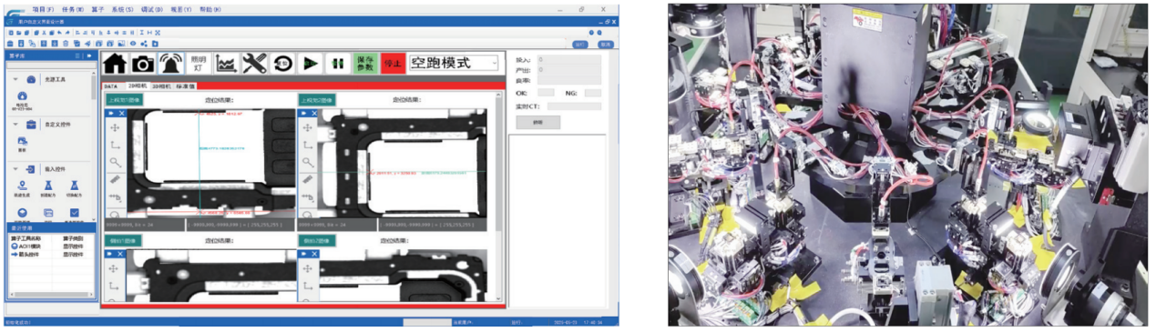 设备用于某品牌手机零部件尺寸测量,软件包含运动控制、机械手通讯、2D测量、3D测量以及MES交互,软件通知上料 机械手上料,通过运控系统将物料依次输送至12个检测位,8个检测模组并行检测,2D检测项包含产品轮廓、孔径、高度等 全尺寸参数,3D检测检测包含产品平面度、位置度、孔径等参数测量,根据测量点差异最高测量精度达到测正负0.003mm, GRR测试<=10%,重复性精度0.01mm,共63项检测数据,检测完成后,软件同步进行数据校准与不合格品标记,并将检测 数据上传至 MES 系统,并触发下料信号通知机械手自动对已检测产品自动下料,实现全自动化在线全尺寸测量。
