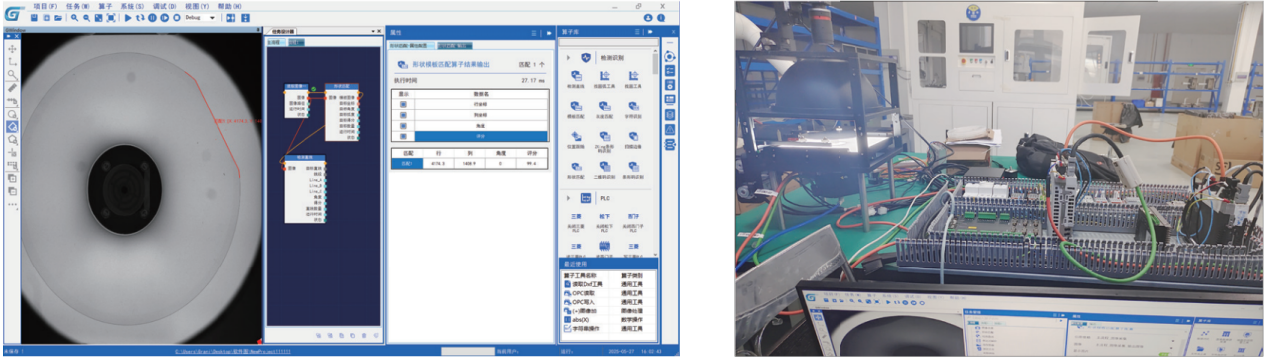 晶圆定位及检测是半导体制造工艺中极其重要的工序。 GS软件连接相机采集晶圆图像,通过抓边算法定位晶圆边缘, 深度学习训练识别半导体字符。实现检测晶圆的角度、中心点位置、字符、异物等。视觉定位精度0.003mm,定位准确率100%,字符识别率99.98%,过检率0.01%。