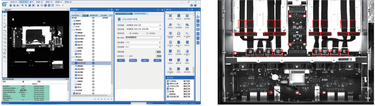 PCBA外观检查是3C消费电子产品生产线中极其重要的工序。 GraniStudio软件连接2D相机和3D线激光相机,实现检 测服务器腔体内PCB主板上元器件的缺失、偏移、变形、异物、螺丝高度等,以及服务器底部金属板上是否存在异物、螺丝是 否缺失、线缆卡扣有无等检测项,测量精度5um,异物检出率99.95%,过检率0.05%。保证了A客户服务器主板在组装安装 的过程中元器件的完整性,排除安装过程中掉落的异物从而影响服务器性能的可能性。