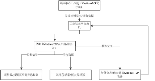 在工业自动化场景中,上位机通过 Modbus-TCP 与 PLC 通信,PLC 作为核心控制单元,一方面控制执行器工作,另一方面采集传感器数据,并与其他 Modbus-TCP 设备进行数据交互,实现整个生产流程的自动化控制与监测。