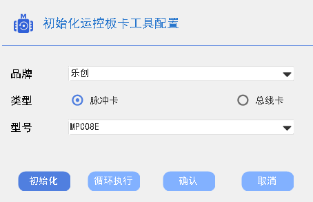 设备使用乐创MPC08E脉冲卡,“初始化运控板卡”算子配置界面上“品牌”项下拉列表选择“乐创”,类型项选择“脉冲卡”,“型号”下拉列表选择MPC08E。本项目使用的是4轴卡,只使用一张运动控制板卡,卡号设置为“0”。如存在多个板卡,可配置板卡卡号。