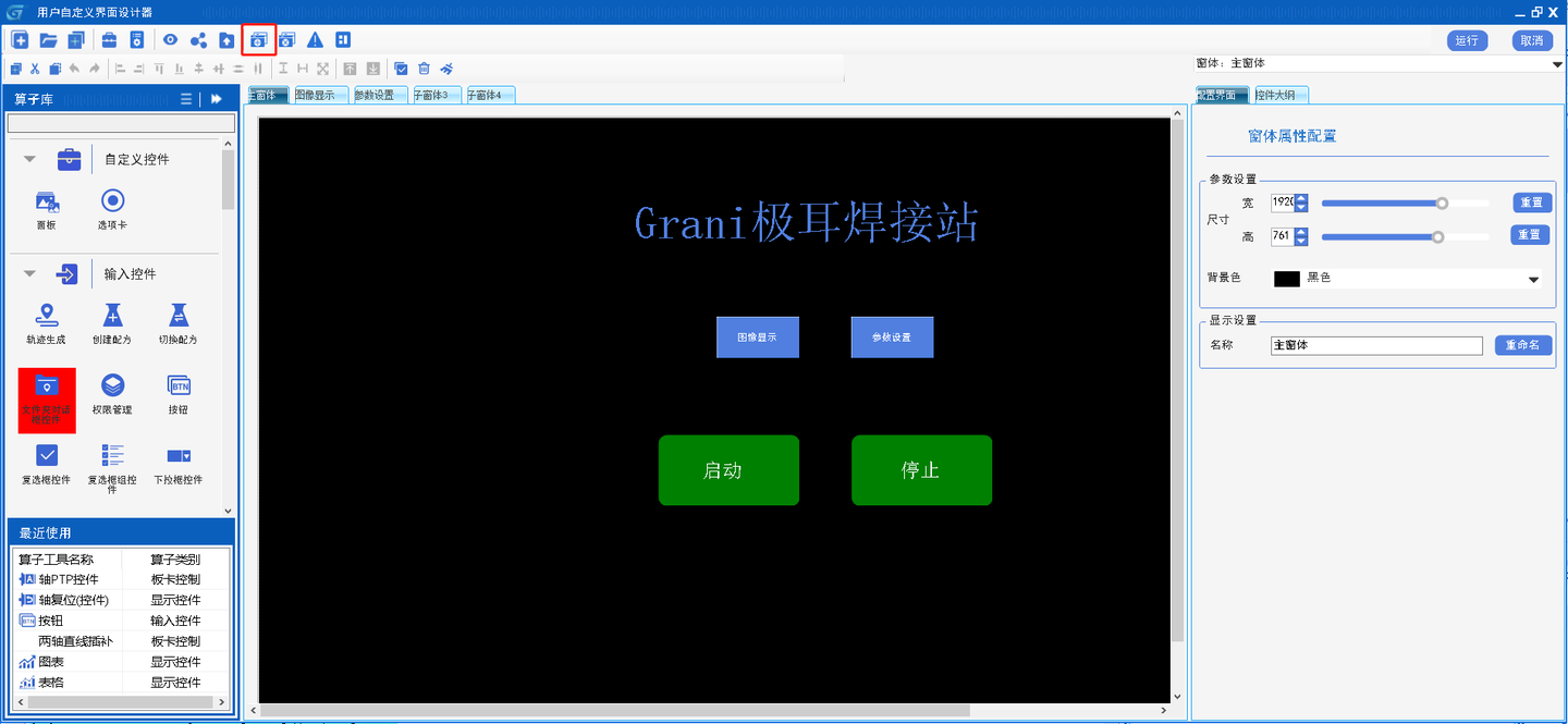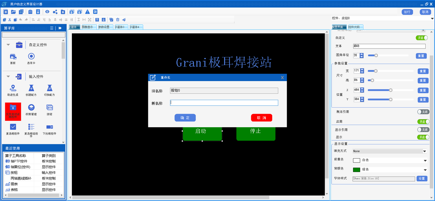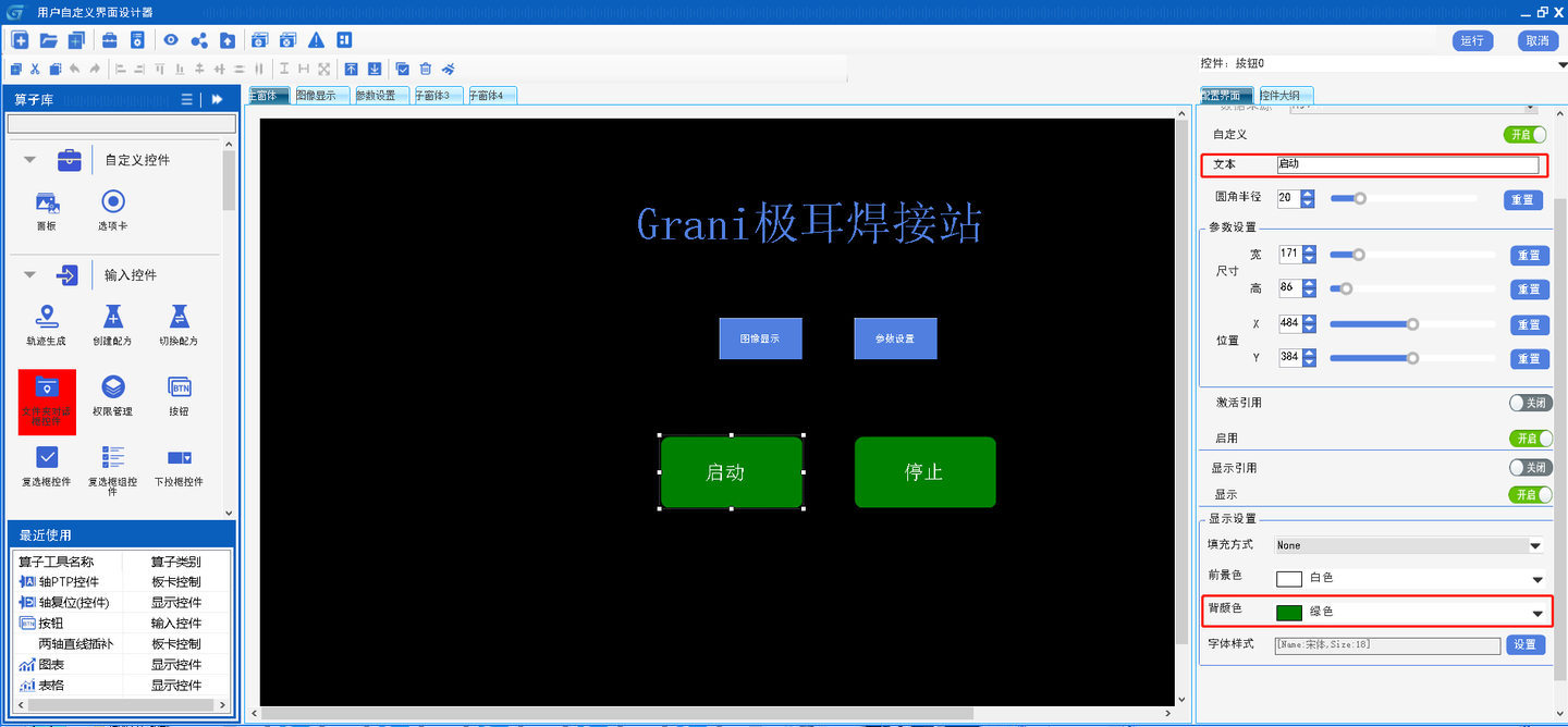 设备开始、停止:通过按钮控件实现,使用事件管理器绑定鼠标单击事件触发对应流程实现功能,配置显示文本、背景色、尺寸、文字大小