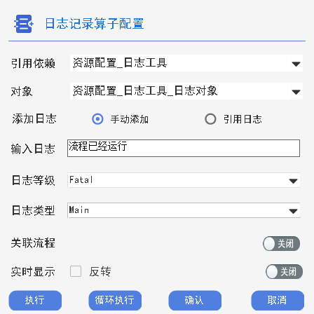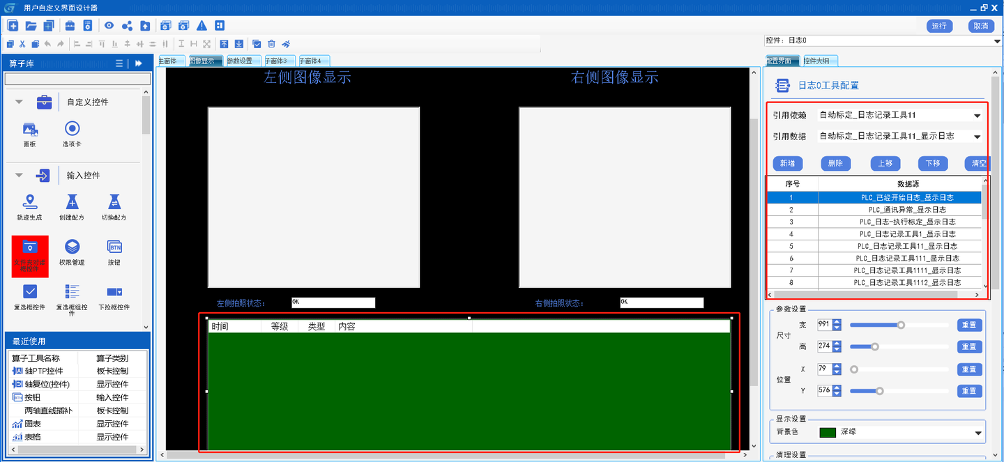 日志显示:使用日志显示控件进行日志显示,将主任务设计器流程中所有日志记录工具添加到显示表格内,流程运行记录时同步显示在日志显示控件中