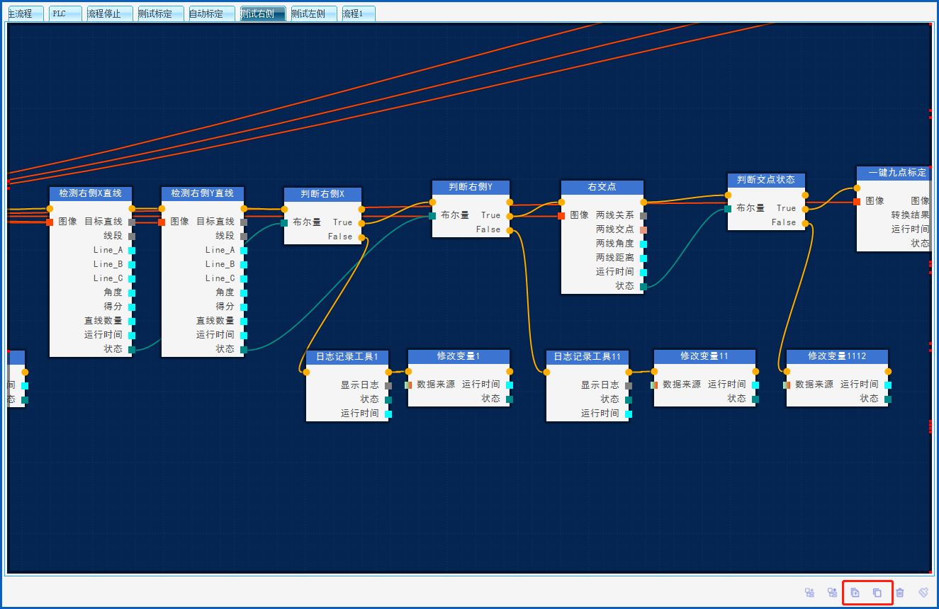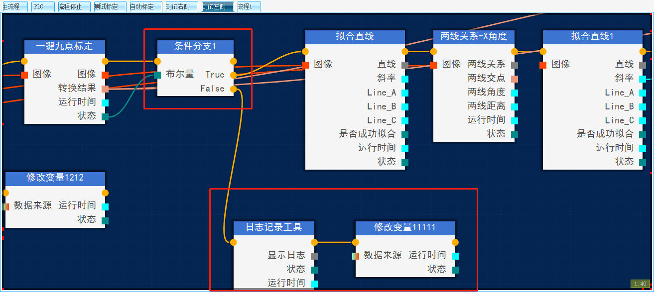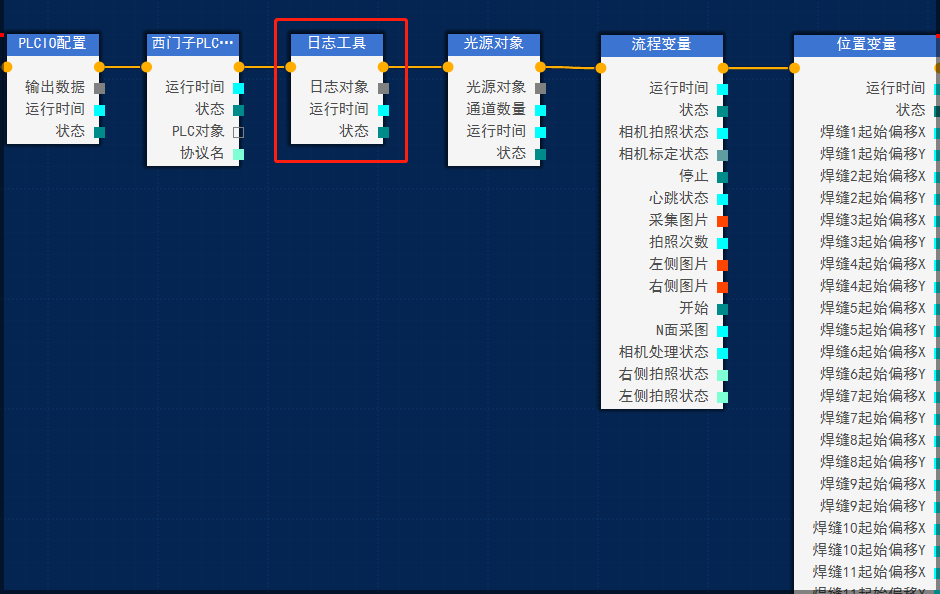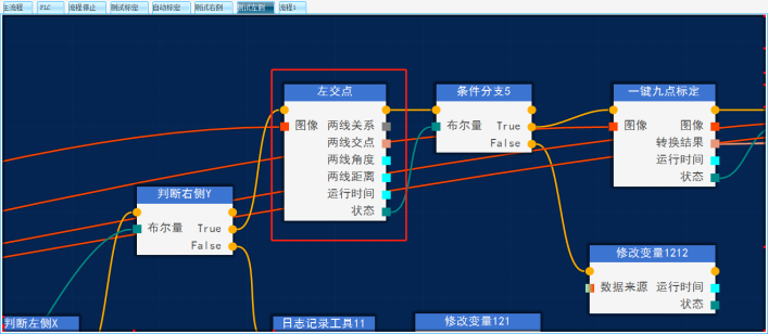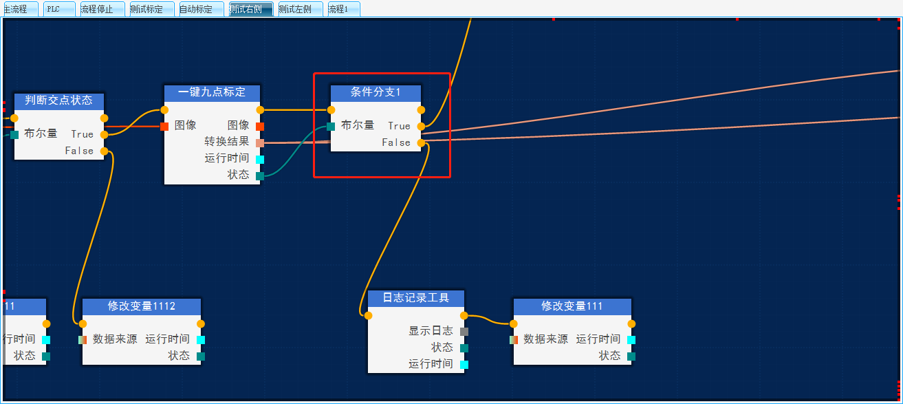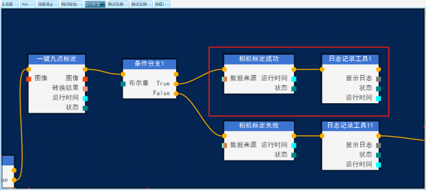 坐标进行转换后需要使用条件分支对一键九点标定算子状态进行判断,防止可能出现标定文件丢失等情况出现导致焊接异常,状态异常通过日志记录并修改相机处理状态变量反馈给PLC流程