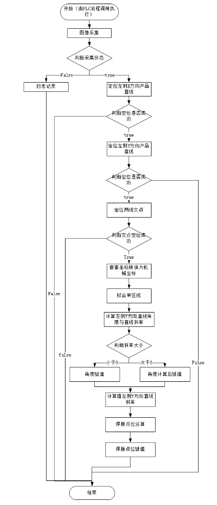步骤11.焊接点位运算:计算前根据Y方向直线斜率大小计算出使用角度,通过条件分支判断斜率大小,动态调整运算角度,确保根据产品实际摆放将焊接点位置发送给机械手,判断斜率是否大于0,大于0,将步骤10计算出的角度通过修改变量算子修改到角度变量中