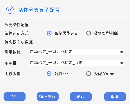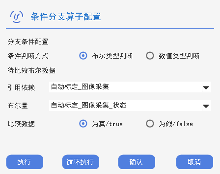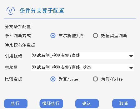 通过多分支工具判断拍照次数变量值,当此变量值为0时表明设备将在右侧进行拍照,配置如下: