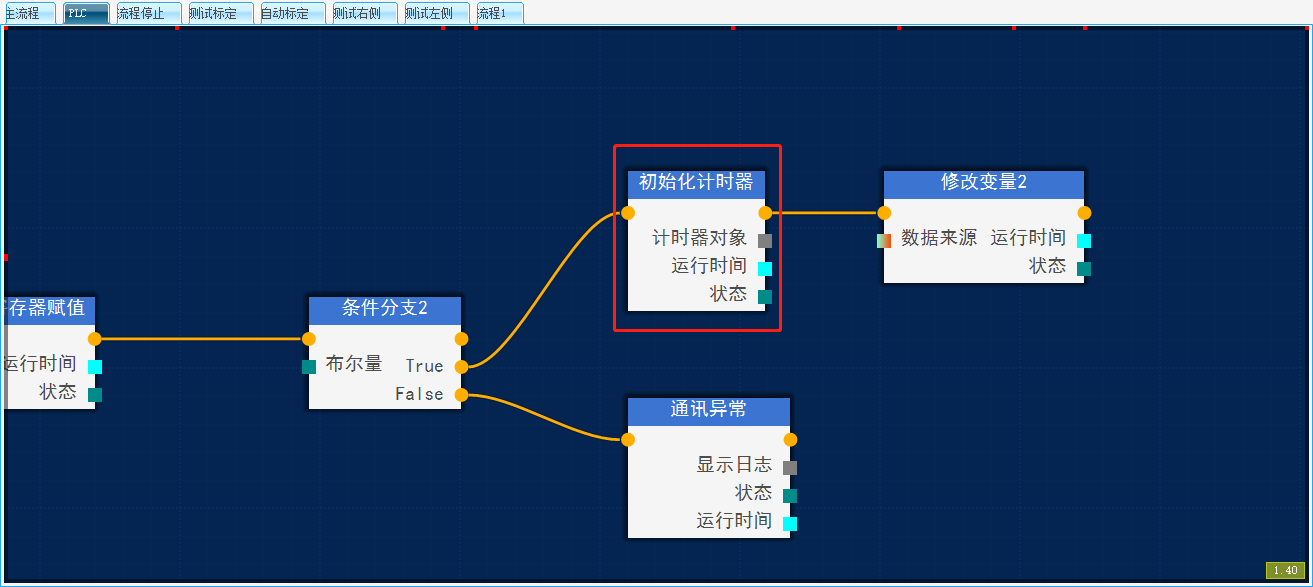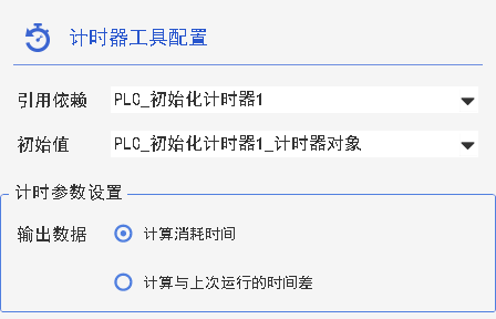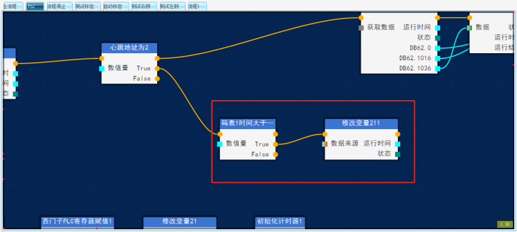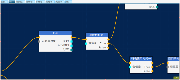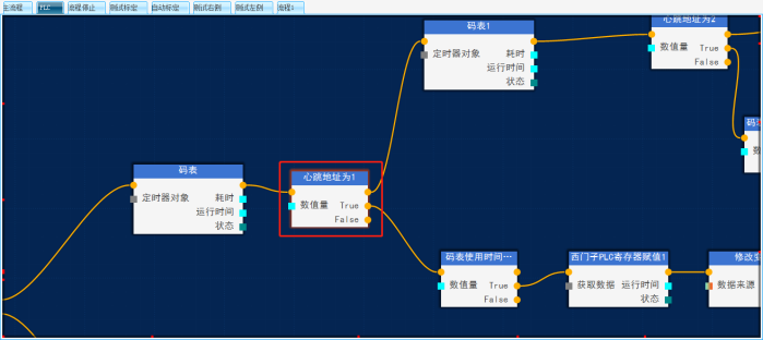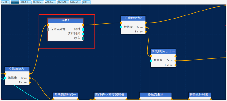 步骤6.记录当前时间:当给心跳地址写入true后需要间隔一段时间才能写入false,先通过码表算子记录时间,引用初始化计时器算子
