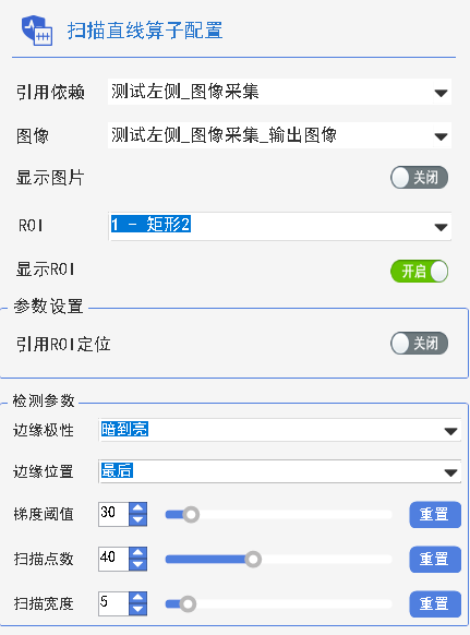 步骤3.定位左侧X方向产品直线:通过扫描直线算子检测电池边缘,扫描直线算子引用采集到图像,在图像显示窗口使用矩形2ROI将边缘线框住根据电池边缘打光效果,设置扫描直线算子边缘极性为暗到亮,边缘位置为最后,算子扫描到线段将线段数据输出