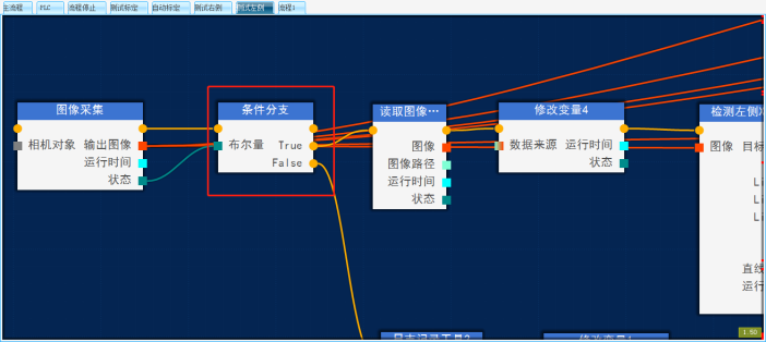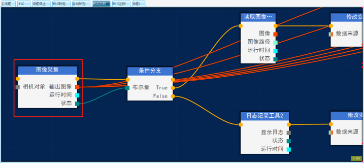 步骤2.判断采集状态:通过条件分支判断图像是否采集成功,如果不成功使用日记记录并将相机处理状态变量赋值为2,PLC流程通过多分支工具对此变量进行判断从而确定右侧定位失败