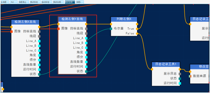 步骤6.判断Y方向直线定位是否成功:通过条件分支引用步骤5检测直线算子状态变量判断检测是否成功,检测成功程序继续执行,检测失败使用日志记录并将相机处理状态变量设置为2,反馈到PLC流程