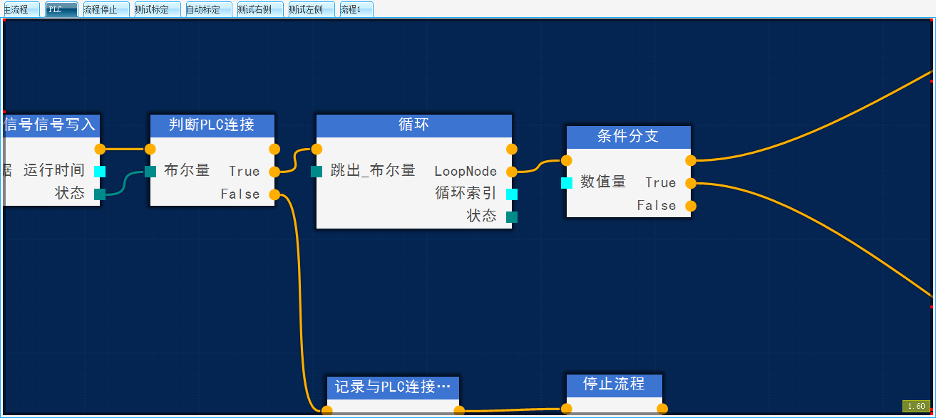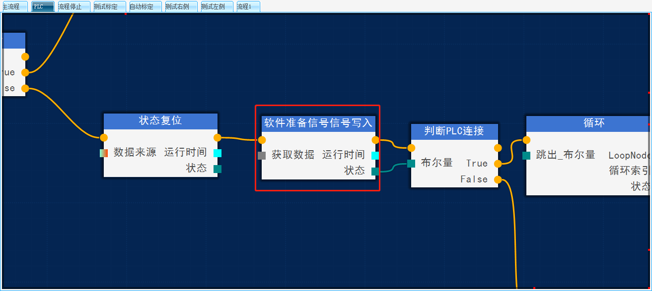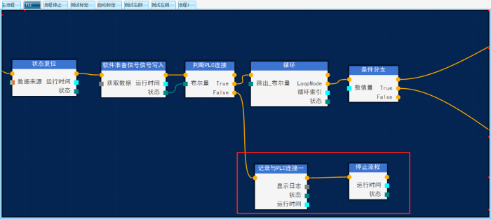 步骤4. 判断是否停止:前三步已经将准备工作制作完,实际使用时操作员点击软件开始按钮后即可为实现长时运行,因此使用循环算子将后续动作循环执行,当操作员点击停止时再将循环退出,配置引用停止变量,当按下停止时执行停止流程,即可结束运行