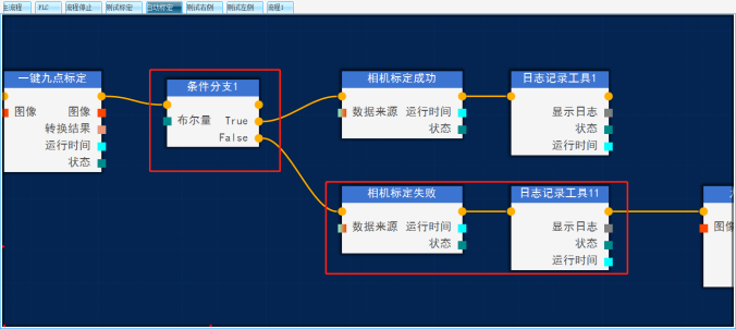 再判断相机标定状态结果,当标定状态为1时表示标定成功;当标定状态为2时表示标定失败,使用多分支工具引用相机标定状态,增加两个分支,分别为1和2