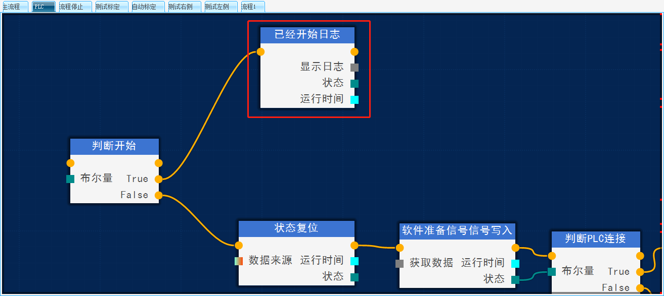 步骤1.判断开始变量:开始变量在打开软件时默认值为false,为false时说明设备没有在运行,通过条件分支判断开始变量是否为true