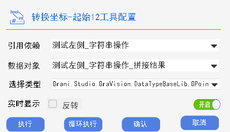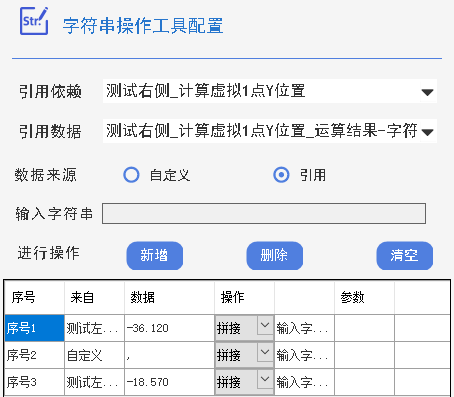 计算出虚拟点XY坐标后通过字符串操作算子将X和Y值拼接成2D坐标格式,算子数据来源选择引用,引用运算结果的字符串格式添加虚拟X值,数据来源修改为自定义,输入“,”进行添加,再将数据来源切换为引用,添加虚拟Y值,执行输出字符串格式的“X,Y”
