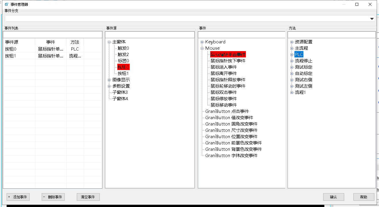 在事件源中显示每个窗体包含的控件,事件列表提供了大量事件,实现开始功能绑定鼠标单击事件即可,在方法列表中选择PLC流程,实现绑定,运行HMI鼠标单击开始按钮运行PLC流程