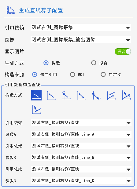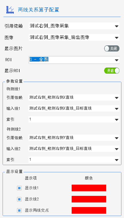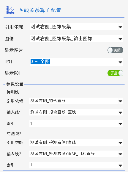 步骤10.计算右侧Y方向直线角度和斜率:角度通过拟合步骤9拟合出的单竖线以及检测Y方向直线获取,使用两线关系算子引用这两条直线,自动运算出两线夹角角度