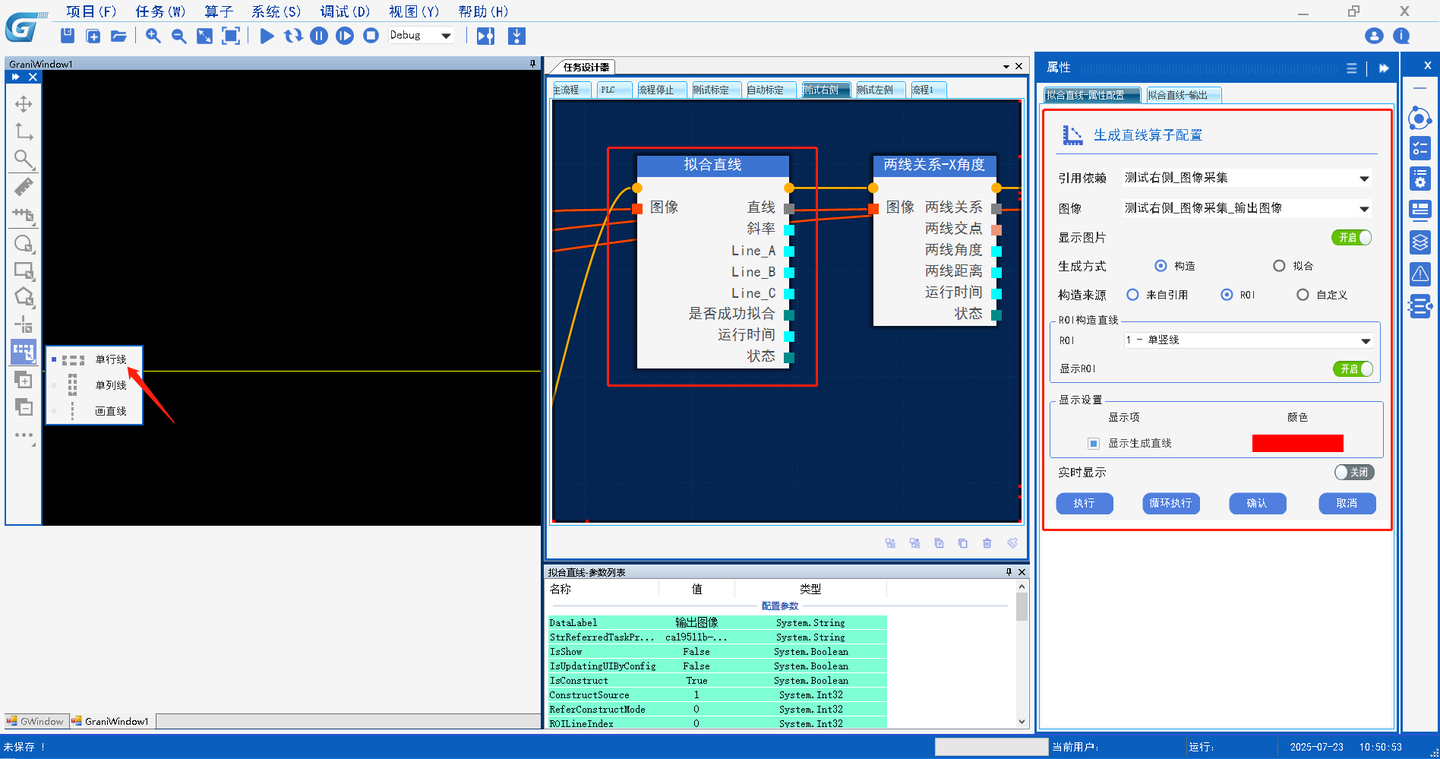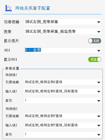 步骤10.计算左侧Y方向直线角度和斜率:角度通过拟合步骤9拟合出的单竖线以及检测Y方向直线获取,使用两线关系算子引用这两条直线,自动运算出两线夹角角度